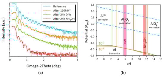 (a) X-ray reflectometry (XRR) spectra of Ni3Al reference, after 110 h H*, after 24 h DIW, and after 24 h NH4OH; (b) Pourbaix diagram of Al-water system at 25 °C, showing the phases of Al in function of electrochemical potential VSHE and acidity pH, at an effective Al3+/AlO2− concentration of 10−6 (orange line) and 10−2 (green line). The pH range of DIW, and NH4OH are shown in purple, and red respectively. The stability region of water lies between the dashed blue lines. Modified from Pourbaix [].