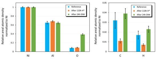 The average composition changes of Ni3Al are compared between a reference sample, after 110 h H*, and after 24 h DIW. The basic cleaning condition with NH4OH was disregarded, as Al was not stable under this condition. Ion beam characterization techniques, such as RBS and ERDA, are very sensitive to changes in elemental composition. These techniques were used to measure Ni and Al areal atomic density. As Ni was expected to be stable under the conditions of the durability tests [,], the Ni areal atomic density was used for normalization. The relative atomic density of Ni, Al, O, C and H, are presented in Figure 7.