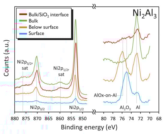 XPS is an effective technique to determine the oxidation state on the surface, which provides information on whether the atom is bound in a compound, or whether it is in pure metallic state. Depth profile can be obtained in sputter-assisted mode. XPS measurement of Ni2Al3 is presented in Figure 8. XPS data for Ni3Al and NiAl are available in the Supplementary Materials section Figure S1.