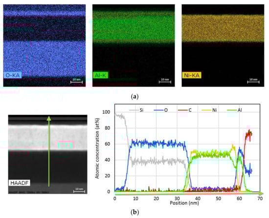 TEM-EDS image of Ni2Al3, illustrated in Figure 9, confirms that the native oxide is composed out of Al and O. Ni is confined within the bulk, which also contains Al and traces of O. The bulk composition therefore has changed compared to nominal. All elements within the bulk metal layer seem to be uniformly distributed. TEM-EDS line scan reveals preferential Al diffusion towards high oxygen concentration, such as at the surface and at the SiO2 interface. This leaves a Ni-rich layer just below the native oxide and on top of SiO2. The Al:O ratio is not stoichiometric 2:3 beneath the surface, indicating formation of sub-oxides where less than the maximum number of Al-O bonds were formed.