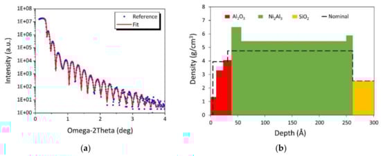 Figure 10 presents the XRR spectra of Ni2Al3. The measurements for the other samples can be found in the Supplementary Materials section Figure S2. A multilayered model was used to account for density gradients, with layer thickness, density and roughness as fitting parameters. The nominal line follows the crystalline density of Al2O3 and Ni2Al3 along the layer thickness measured from TEM images. The density of the largest bulk layer is considered the bulk density of the film, and is tabulated in Table 4.