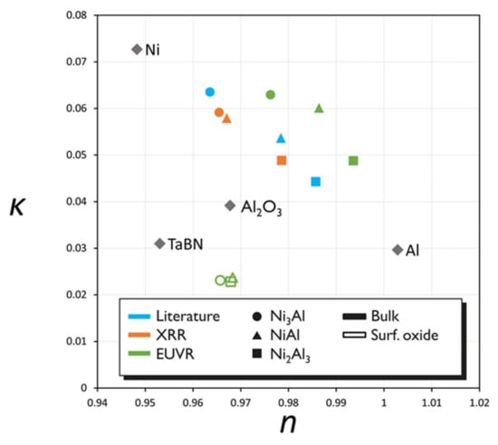 The first set of n,κ is calculated using crystalline density and composition of NixAly compounds from literature. The second set of optical constants is calculated based on bulk density and bulk composition obtained with XRR. These density and composition values are tabulated in Table 4. The third set of optical constants are calculated from fitting EUVR data, which were collected with PTB’s soft X-ray radiometry beamline at BESSY II facility. The EUV reflectance of Ni3Al, NiAl and Ni2Al3 was measured through wavelength and through incidence angle. The results have previously been reported in []. We fit the measured EUV reflectance with a three-layer stack model, consisting out of native oxide, bulk metal, and SiO2 on Si-substrate. The fitting parameters consist out of layer thickness, and optical constants. The EUV reflectance fits are illustrated in the Supplementary Materials Figure S3; the resulting optical constants at 13.5 nm wavelength are tabulated Table 5. Figure 11 compares the optical constants obtained through literature, XRR, and EUVR.