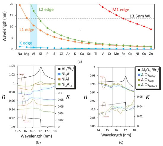 However, EUVR found the refractive coefficients n much closer to unity. The calculated optical constants of the NixAly compounds lie linearly between those from the single elements Ni and Al, and is based on their tabulated atomic scattering factor fi, which is very sensitive to absorption edges. Depending on the chemical state of the element, the absorption edge can shift through wavelength, resulting in different optical constants. Few elements have absorption edges near 13.5 nm EUV wavelength, one of which is Al. Metallic Al L2 absorption edge lies at 73.1 eV [], corresponding to a wavelength of ~17 nm, as illustrated in Figure 12a.