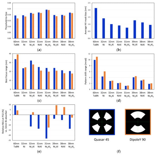 Comparison of (a) threshold-to-size, (b) shadowing effect, (c) best focus shift through pitch, (d) pattern shift through focus, and (e) contrast change normalized to 32 nm Ni absorber at 32 nm pitch for the following absorber stack: 60 nm TaBN, 32 nm Ni, 32 nm Ni3Al, 31 nm NiAl, 31 nm Ni2Al3, 39 nm Ni3Al, 38 nm NiAl, and 38 nm Ni2Al3, at 0.33 NA for (f) Quasar (blue) and DipoleY (orange) illumination.