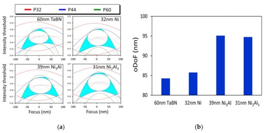 (a) Overlapping process windows, and (b) overlapping depth-of-focus under the DipoleY illumination at 0.33 NA of 16 nm trenches at a pitch of 32 nm (red), 44 nm (blue), and 60 nm (green), for 60 nm TaBN, 32 nm Ni, 39 nm Ni3Al, and 31 nm Ni2Al3 mask absorbers.