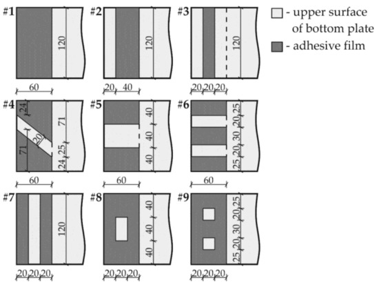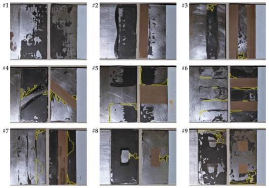 Investigations were conducted for nine types of specimens (Figure 2): one intact (#1) and eight (#2–#9) with different defects in the form of partial debonding. The defects were modelled as a lack of glue on a part of the overlap surface. A PTFE tape of 0.2 mm thickness was used to prevent the glue from leaking to the debonding areas of the damaged joints. The adherends of each specimen were separated after the experimental measurements to determine the exact geometry of defects in the prepared joints. Photographs of the disconnected joints are presented in Figure 3.