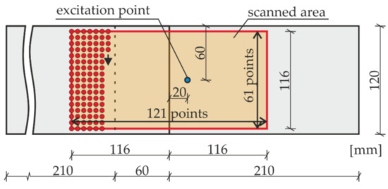Experimental measurements consisted of the excitation of Lamb waves in the lower adherend and the collection of wave propagation signals in the selected area of the specimen. The experimental setup is presented in Figure 4. The excitation signal was generated by means of the arbitrary function generator AFG 3022 (Tektronix, Inc., Beaverton, OR, USA) and the high-voltage amplifier PPA 2000 (EC Electronics, Krakow, Poland). Lamb waves were excited by the plate piezoelectric actuator NAC2024 (Noliac, Kvistgaard, Denmark), with dimensions of 3 × 3 × 3 mm3 and a resonant frequency of over 500 kHz. The actuator was bonded to the bottom side of the specimen (Figure 4b) using petro wax 080A109 (PCB Piezotronics, Inc., Depew, NY, USA). The excitation signal was a five-peak wave packet obtained from a sinusoidal burst with a carrier frequency of 200 kHz modulated by the Hanning window. There were also additional excitation signals for specimens #3 and #6 that differed in the frequency value from the basic variant (100 kHz and 50 kHz, instead of 200 kHz). Acquisition of the wave propagation signals was realized by the scanning head of the laser vibrometer PSV-3D-400-M (Polytec GmbH, Berlin, Germany) with a VD-09 velocity decoder (Figure 4a). Time signals were acquired with a sampling frequency of 2.56 MHz and were averaged 40 times to improve the signal-to-noise ratio. The excitation signal was triggered as external and monitored using a reference channel of the vibrometer. To improve the backscatter of light, the scanned surface was covered with retro-reflective sheeting. Velocity values (out-of-plane components) were recorded in the time domain in 7381 points that were distributed at the top side of the specimen (on the surface of the upper plate with no PTFE tape attached, see Figure 3). The area was scanned point by point in the mesh of 61 rows and 121 columns (Figure 5), giving a scan resolution of 1.933 mm and about nine scan points per the shortest wavelength. Signals sensed at all of the points allowed for us to prepare a map of the propagating waves, i.e., a two-dimensional plane view at a specific time instance.
