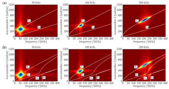 Before analyzing the defects in the lap joints, the characteristics of Lamb waves were determined for two specimens: a single steel plate with a thickness of 3 mm and dimensions of 240 mm × 300 mm, and two steel plates that were adhesively bonded with an adhesive layer with a thickness of 0.2 mm. In each plate, a five-cycle Hanning windowed sine function with center frequencies of 50 kHz, 100 kHz, and 200 kHz was used as an excitation signal. Out-of-plane vibration signals were measured in 101 points that were evenly distributed along a line with a length of 10 cm. The wavenumber-frequency relations (Figure 6) were obtained using 2D-FFT (cf. [23,38]). In the experimental results, theoretical dispersion curves that were obtained using GUIGUW software [39] based on the semi-analytical finite-element formulation [40] were superimposed.