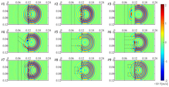 Figure 7 shows snapshots of the guided wave propagation signals that were obtained in the experimental scanning of the analyzed specimens. The SLDV maps are presented at the time instance of 27.7 μs. Disturbances of the wavefront shape on the disbond area were visible for each specimen from #2–#9 when compared with the intact specimen #1. The differences were more or less considerable, depending on the geometry of the defect. The most significant disturbances were observed for the specimens with stripped defects skewed and parallel to the primary direction of propagation (#4–#6). For specimens that had the disbond area in the shape of a strip perpendicular to the direction of propagation (#2, #7), the changes were not clearly visible. The exception was specimen #3, which had no adhesive near the edge of the overlap and resulted in the limited appearance of the wavefront on the overlap surface. Internal defects (#8, #9) were moderately detectable. In summary, the presence of the defects in the damaged specimens was visible in the maps, but their geometry was not determinable.