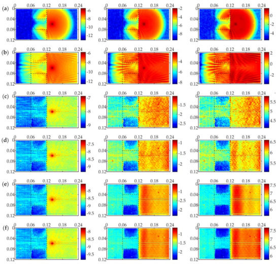 WRMS maps (values in (m/s)) with linear weighting factor (wr = r), time window T = 3.00 ms and with different excitation frequencies f = 200 kHz (first column), f = 100 kHz (second column), f = 50 kHz (third column): (a) specimen #6; and (b) specimen #7.