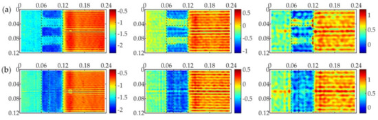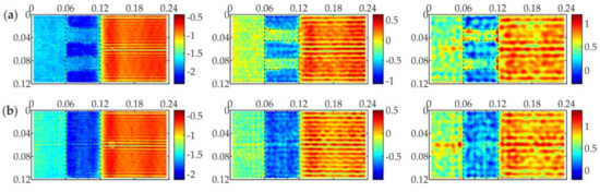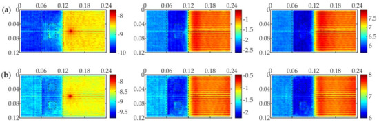 WRMS maps (values in (m/s)) with square weighting factor (wr = r2), time window T = 3.00 ms and with different excitation frequencies f = 200 kHz (first column), f = 100 kHz (second column), f = 50 kHz (third column): (a) specimen #6; and, (b) specimen #7.
