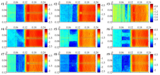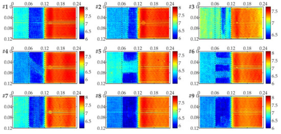 Figure 11 also shows the WRMS maps for all of the considered specimens (#1–#9), but for the square weighting factor (wr = r2). The visual assessment of the presented maps led to conclusions that were similar to the ones resulting from analysis of maps for the linear weighting factor (wr = r). The value of m power affected the clearness of images: the ones for the linear weighting factor appeared to be clearer. Based only on the visual assessment of the defect images, it was not possible to judge which variant of weighting factor provided the clearest results.