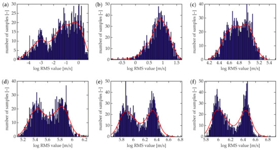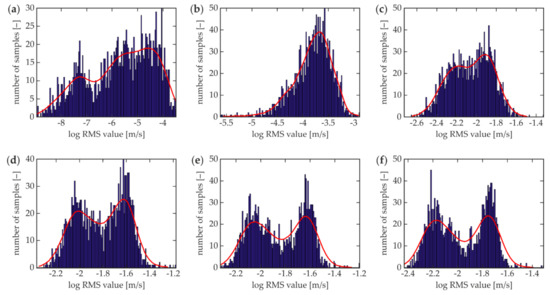 Histograms of WRMS values (wr = r) for specimen #5 with different time windows: (a) T = 0.03 ms; (b) T = 0.05 ms; (c) T = 0.50 ms; (d) T = 1.00 ms; (e) T = 2.00 ms; and, (f) T = 3.00 ms.