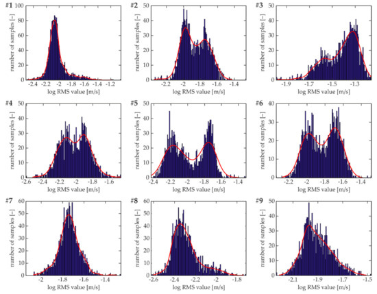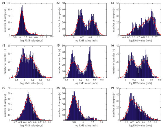 To move forward, histograms for all of the specimens were prepared with the time window T = 3.00 ms. Figure 16 presents the histograms with the linear weighting factor. For the intact joint (specimen #1), a common unimodal distribution was obtained. The calculated values were concentrated about a singular mode that represented the undamaged area of the adhesive joint. Typical bimodal distributions were obtained for specimens with a clear defect image (#2–#6). For specimens #7–#9, the distributions were likely to be unimodal, but when compared with specimen #1, their shapes were not that regular, and it was clear that their widths were greater than that of specimen #1. This may result in the conclusion that the defect was present, but it could not be clearly observable. Figure 17 shows the histograms with the square weighting factor. The conclusions from the analysis of each histogram were similar to ones based on Figure 16.