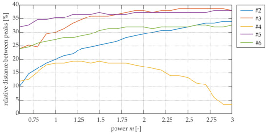 Figure 18 shows the relationships between the relative peak distance and the weighting factor that is represented by the power m for specimens #2–#6 that clearly presented bimodal distributions. It could be seen that for most of the specimens, higher values of power m resulted in the greater value of relative peaks distance. This means that the higher the value of m, the clearer the image of the defect on the WRMS maps. It is worth noting that the value of the relative peaks distance stabilized at a specific value of m individually for each defect, so the increase in m could not infinitely the improve the quality of maps. Furthermore, specimen #4 provided a different relationship than the others where the relative distance between the peaks at the beginning increased with power m and then decreased. Maximal values were observed for the power m between 1 and 1.5. Based on the calculations presented above, it was concluded that the proposed analysis provides the opportunity to improve the process of determining the optimal value of the weighting factor (in fact, the power m) for damage imaging using WRMS.