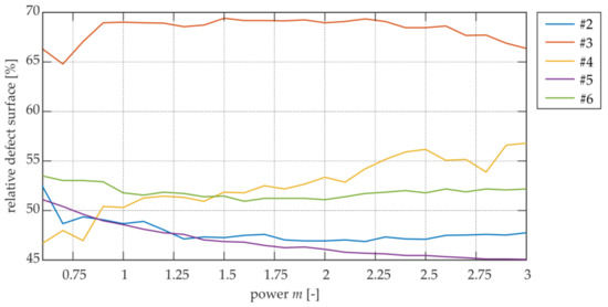 Relationships between the relative defect surface and weighting factor (represented by power m) for specimens #2–#6.