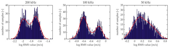 One additional aspect of this research included the statistical analysis of the influence of the excitation frequency. Figure 20 shows the WRMS histograms for specimen #6 with different excitation frequencies. For the lowest value (50 kHz), the unimodal (but asymmetric) distribution was obtained. Higher frequencies (100 kHz and 200 kHz) showed typical bimodal distributions with different characterization. To compare them, the relative peak distance was calculated. For 100 kHz, a value of 34.67% was obtained, whereas for 200 kHz, it was 27.33%. This meant that the 100 kHz frequency provided results with more differentiated WRMS values obtained in areas with good and poor quality (resulting in clearer defect image). Furthermore, the percentage of the defect surface was determined with the use of the above-presented method with the central limit point. For 100 kHz, the result was 35.67% and for 200 kHz, a value of 51.78% was achieved. When compared to the measured value (33.33%, Table 1), the nearest value was obtained for 100 kHz. However, due to the lack of results for other specimens revealing bimodal distribution, it was not possible to conclude on the supremacy of this frequency. Further research could help to solve this problem.