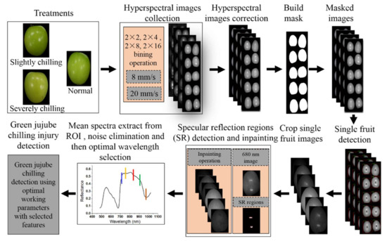 To our knowledge, little research has been done to investigate the effect of spectral resolution and scanning speed on chilling injury detection of green jujube based on hyperspectral imaging. Therefore, the main objective of this research was to select the optimal spectral resolution, scanning speed for green jujube hyperspectral images. To achieve this goal, the specific objectives were (1). To acquire the hyperspectral images of each sample at different scanning speeds and spectral resolutions; (2). Identify the optimal wavelengths for chilling damage detection; and, (3). Develop a feasible classification model for green jujube chilling injury discrimination based on selected features.