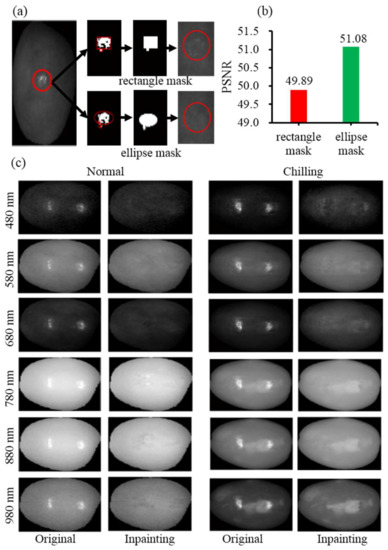 Figure 2a shows the effect of different shapes of specular reflection region mask on inpainting. It was found that rectangle mask did not show a desirable inpainting performance because the pixels that are located along boundary still presented difference of image texture from source region (unaffected region) with sound pixels, which indicated that pixels that are distributing along boundary had influence on image inpainting. However, a more spatially homogeneous texture in target region was synthesized after the application of ellipse mask on account of that more interferential pixels were removed. Apart from visual evaluation, it also displays a highest PSNR value of 51.08 based on ellipse when compared with that of original and rectangle ones (Figure 2b), demonstrating that the ellipse mask was more feasible for spectral image inpainting for green jujube. Figure 2c displays representative spectral images of normal and chilled green jujubes at 480 nm, 580 nm, 680 nm, 780 nm, 880 nm, and 980 nm, respectively, before and after inpainting operation using ellipse mask. The results here indicate that the inpainting operation using Criminisi algorithm could well reconstruct specular reflection region in hyperspectral images both in visible and near-infrared range.