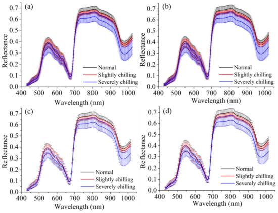 Mean spectra of normal (n = 120), slightly (n = 120) and severely (n = 120) chilling samples at different scanning speeds and spectral resolutions. (a,b) were 8 mm/s and 20 mm/s with spectral resolution of 1.25 nm, respectively. (c,d) were 8 mm/s and 20 mm/s with spectral resolution of 5.03 nm, respectively.