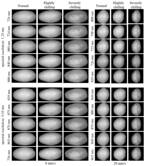 Surface blemish and internal defects in chilled samples causes cell structure breakdown, which would result in different light scattering properties, thus leading to different spatial textures between the normal and chilled tissues. Hence, image textures from spectral images at selected wavelengths were extracted for further analysis. Figure 5 displays the images at the first five optimal wavelengths selected by random frog at scanning speed of 8 mm/s and 20 mm/s, respectively, with two spectral resolutions. The reflectance of normal tissue was higher that of damaged regions. A larger area of chilling symptom in severely chilling green jujube was found due to a more serious chilling damage. However, the image textures in the selected spectral image of chilled samples collected at scanning speed of 20 mm/s did not show a significant difference to those of low scanning speed (8 mm/s), except for scanning lines. The difference of image texture in selected images between normal and chilled green jujubes indicated the potential ability of performing classification by extracting the textural features from these images.