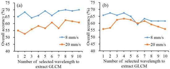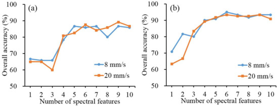 Different light scattering properties in normal and defective pulp tissue would bring about different patterns of spatial textures. The discriminant capability of the image-based features was evaluated by the three-class overall classification accuracy. Among the different combinations of scanning speeds and spectral resolutions, the overall classification accuracies varied from 64.2–70.0%, 52.5–62.5%, 59.2–67.5%, and 55.8–63.3%, respectively, for 8 mm/s and 20 mm/s using data with spectral resolution of 1.25 nm (Figure 8a) and 8 mm/s and 20 mm/s using data with spectral resolution of 5.03 nm (Figure 8b). The classification performance was not significantly improved with the increasing number of image textural features. The low classification results also could be observed in those of 2.51 nm and 10.08 nm (Figure S4). In comparison with spectral-based classification, the three-class performance using image-based features was much poor, indicating that image-based features were not feasible for detecting chilling damage in green jujubes. The high misclassification error had been attributed to the fact that no obvious symptom could be found in slightly chilling samples, resulting in the misclassification between normal and slightly chilling classes.