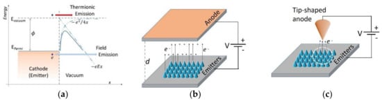 Several technological applications need controlled electron sources, examples are X-ray sources [1], flat panel displays [2,3], electron microscopy/lithography [4], and microwave vacuum electronic devices [5]. One of the most common techniques for generating an electron beam is to emit electrons from metals by thermionic effect, in which a metallic emitter is heated at temperatures typically above 1000 °C so that electrons in the conduction band gain enough energy to overcome the work function of the emitter. However, the main drawbacks of thermionic emission are the high energy consumption, the wide energy spectrum of the emitted electrons and the material degradation caused by the high operating temperature. A different approach is that of the “cold cathodes”, which operate at room temperature. Electrons are extracted from the surface of a metal or a semiconductor by an electric field (field emission, FE) through quantum mechanical tunneling. This process, which typically requires a high electric field (107–108 V/cm) [6], creates high current density with thinner energy distribution of the emitted electrons [7,8]. Moreover, cold cathodes provide very stable emission over time, and can be easily and advantageously miniaturized.