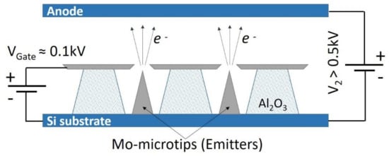 Mature technology was achieved before the nineties with the development of micro-gated field-emission arrays (FEAs) called Spindt emitters [43], in which large arrays are created by micro-fabrication technology employed in the electronics industry (Figure 2) to be employed for flat panel displays [44,45].