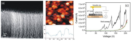 (a) SEM image (lateral view) of vertically aligned MWCNTs, grown by catalytic chemical vapor deposition on a silicon substrate with Ni catalyst. (b) Scanning Probe Microscopy imaging of area of the film surface. Lower plot corresponds to the profile of solid line represented on the image. (c) Field emission current versus voltage measured at cathode–anode separation and pressure of mbar. After a first sweep from 0 to 200 V the characteristic remains stable for successive sweeps. Adapted with permission from [32], Copyright Elsevier, 2009.