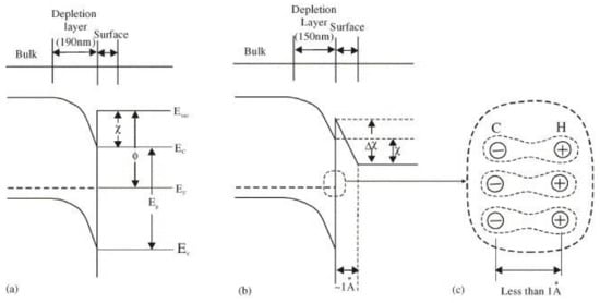 (a) Schematic of the energy band diagram for a clean diamond surface with a positive electron affinity. (b) Schematic of the energy band diagram of a hydrogenated diamond surface with negative electron affinity. (c) Possible atomic arrangement of dipole layer on the hydrogenated diamond surface. The mentioned “surfaces” refer to the single crystalline type IIb diamond. Image reproduced with permission from [67], Copyright Elsevier, 2005.