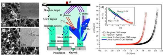 A different approach, concerning growth of graphene on CNT or nanostructures, has been also intensively investigated. Deng et al. [168,169] reported excellent FE from few-layer graphene (FLG)–carbon nanotube hybrids synthesized using radio frequency hydrogen plasma sputtering deposition. They obtained few-layer graphene sheets sparsely distributed on top of CNTs with about 2–10 layer sharp edges (see Figure 6). Such a unique structure offers advantages from both the high aspect ratio of CNTs as well as from the sharp edges of flakes, resulting in a turn-on field below 1 V/ and a field enhancement factor of about 4000.
