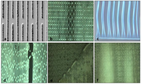 Defects during the microfabrication process using LIGA (“Lithographie, Galvanoformung, Abformung”) technology: (a) unwanted cross-links; (b) lamellae deformation; (c) high aspect ratio (HAR) structure collapse; (d) cracks; (e) bubbles; and (f) bad adhesion (identified by non-homogeneity in the focusing imaging at a microscopic level, showing parts of the image blurry).
