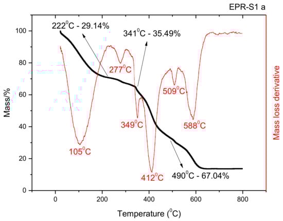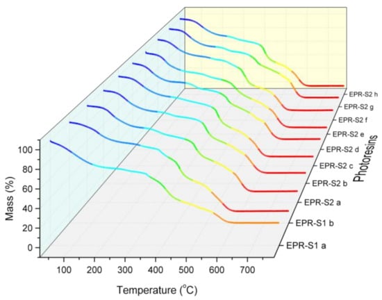 The solvent content of the photoresists was evaluated by TGA, performing the oxidative process of the material until 800 °C. Figure 6 shows the results for the resin EPR-S1 and is used as the example to explain the main changes during the degradation process.