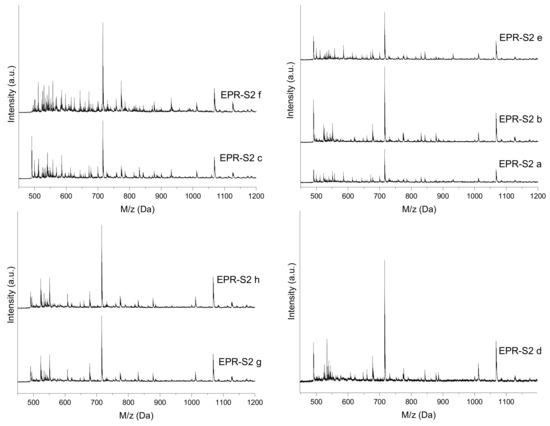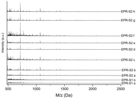 Although the major compounds are the same, there are distinct profiles in the samples (e.g., in the mass profile of sample EPR-S2_f are several mass peaks that are not observed in the spectra of the other samples). These differences are due to the synthesis procedure applied. Observing with more details, the range of low-mass spectra (Figure 9, region between 500 and 800 Da), the samples can be separated into groups: the samples EPR-S2_c and EPR-s2_f; samples EPR-S2_b and EPR-S2_e; samples EPR-S2_a, EPR-S2_g, and EPR-S2_h; the sample EPR-S2_d; and finally, the EPR-S1 series. The samples EPR-S2_c and EPR-S2_f presented several mass peaks in the low-mass region, meaning that the polymer chains vary (high polydispersity) or/and had several secondary products. The samples EPR-S2_b and EPR-S2_e are composed mostly of dimers and trimers of the same size approximately. Also, among the samples EPR-S2_a, EPR-S2_g, and EPR-S2_h, the spectral profile is similar. The compositions of sample EPR-S2_d and the EPR-S1 series consist mostly of dimer molecules. These differences in molecular size distribution might result directly in different physical-chemical properties.