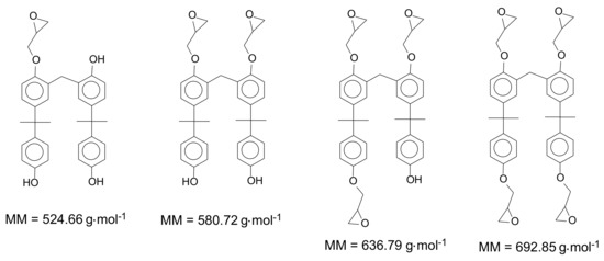 Moreover, in the spectra, it is also possible to observe several peaks that represent the oligomers in different compositions regarding the bonds with the epoxy groups. The theoretical possibilities are monomer two possible peaks; dimer four possible peaks (see Figure 10 using the dimer as an example); trimer six possible peaks; tetramer eight possible peaks; pentamer ten possible peaks; and hexamer twelve possible peaks.