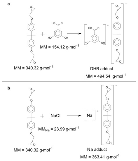 To evaluate the spectra, it is necessary to take into account the influence of the matrix dissociation during the analysis method. The MALDI-TOF has the advantage of avoiding the fragmentation of analyte molecules when a light-absorbing matrix is used. Thus, only intact molecules are observed in the mass spectrometer. For polymer samples, it is possible to identify all the absolute sizes in the distribution after the polymerization step. However, it is common that the matrix has an interaction with the sample, leading to the formation of adducts [35,40,41,42,43,44]. causing some differences in the Dalton values expected. As mentioned in the methods section, in this work DHB and sodium chloride were used as matrices. Therefore, it could be possible that the compounds have increased Dalton values. As an example, the main possible adducts for the monomer are presented in Figure 11.