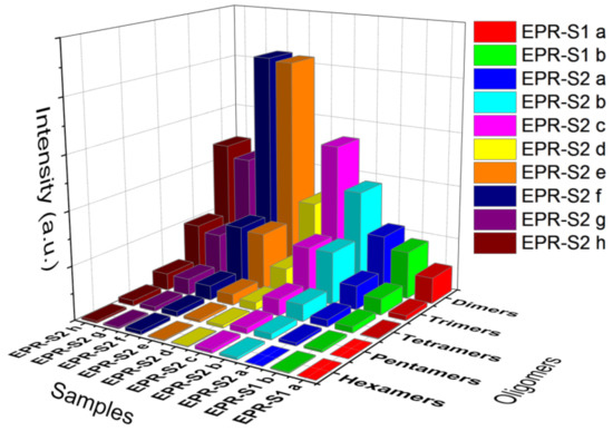The samples presented different compositions mainly in the dimers and trimers (Figure 13) and in the non-epoxidized dimers (dimers ED0, Figure 14) (e.g., EPR-S2_b and EPR-S2_c are the most concentrated with respect to dimers ED0; the sample EPR-S2_c shows almost four times higher concentration than the other samples). The samples of EPR-S1 contain a small amount of dimer ED0. It is important to mention that the concentration of the dimers ED0 in the samples is comparable to the epoxidized oligomers with respect to the intensity values.