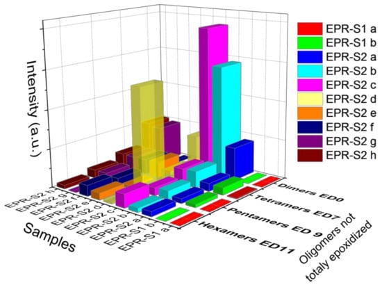 Observing the spectra (Figure 8 and Figure 9), there are significant concentrations of the dimer ED4 (715/716 Da) at all the samples. Some samples showed in their composition, the dimer ED0 (491/492 Da). In this case, it can be considered as a contaminant in the mixture because this structure does not have epoxy groups to support crosslinking. In all samples, considerable concentrations of the trimer ED6 (1068/1069 Da) were present in their composition. Also, all the samples showed traces of the tetramers ED7 (1365/1366 Da) and ED8 (1420/1421 Da). An important characteristic was that the samples EPR-S2_c and EPR-S2_f contained several traces of secondary products (oligomers not epoxidized entirely) in the region of 500–1000 Da, which affects the physical-chemical properties. Thus, although the samples theoretically have the same composition, due to the findings, it is probable that their physical-chemical properties are not the same. Also, a significant characteristic to observe is the influence of the incomplete oligomers in the photoresists. The spectra in Figure 13 and Figure 14 present the amount of the oligomers and the incomplete oligomers for the different samples.