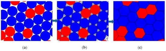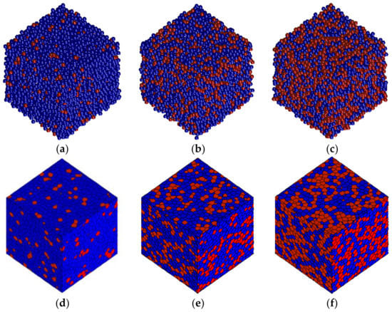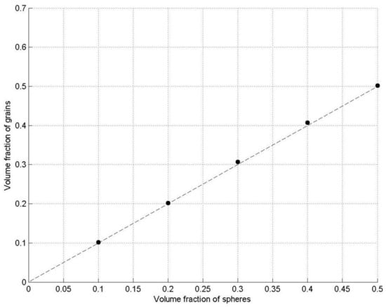 In Table 1, we can see that the mean volume of grains is about 1.2, which is slightly larger than that of its initial sphere (i.e., 1). This is due to the space gap between the spheres in RCPS (Figure 1a), which is filled when the Voronoi diagram in Figure 1b is formed. Nevertheless, because the volumes of both phases increase, the volume fraction does not significantly change, as shown in Figure 3, which means that our approach can precisely control the volume fractions of individual phases.