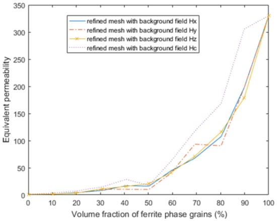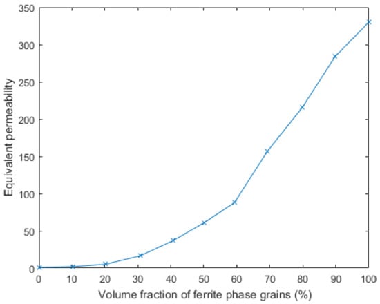Figure 5 shows the modelling results for the effective relative permeability variation with the ferrite fraction in the ferrite–austenite steel samples when the background field is a unit-uniform magnetic H-field (equally distributed) vertically penetrating the steel sample from top to bottom. It can be derived that the equivalent permeability of austenite–ferrite in the RCPS-VM microstructure will rise as the volume fraction of the ferrite grains increases (and the permeability value of ferrite is much larger than that of the austenite).