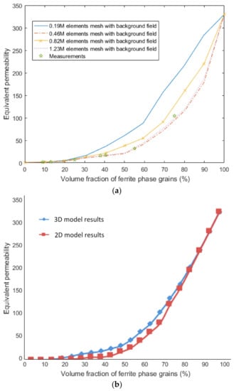 Figure 9a shows the experimental data and equivalent permeability of austenite–ferrite in the RCPS-VM microstructure when the model is meshed into 0.19 M, 0.46 M, 0.82 M and 1.23 M elements when the background field is a unit-uniform magnetic H-field vertically penetrating the steel sample from top to bottom.