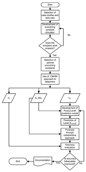 All these values are used in determining the time-series parameters such as the level (LT), growth rate (bT) and seasonality (SNT) as well as the forecast (YT) by the conventional multiplicative Holt-Winters method. Moreover, the determined values of three parameters would also help to estimate the error (EL) that is perceived to be magnified by the stationary nature of the initial values. In the fuzzy logic-based level prediction model the parameters LT, bT, SNT and the actual demand YT are taken as input variables, while the values of the predicted level (LTpred) is considered as the output. A Mamdani fuzzy inference system is applied to contemplate the judgmental knowledge and the relationships established between the variables by means of IF–THEN rules. A de-fuzzification method is employed to obtain the non-fuzzy levels (LTpred) which are embedded into the multiplicative Holt-Winters method to obtain the collaborative multiplicative Holt-Winters (Coll-MHW) model-based forecasted demand (YTc). Finally, the accuracy of our proposed collaborative model is assessed by comparing the MAD, MSE and the coefficient of determination for real-life industrial data and two case studies extracted from literature. A brief summary of the research methodology is depicted in Figure 1 by a flow diagram.