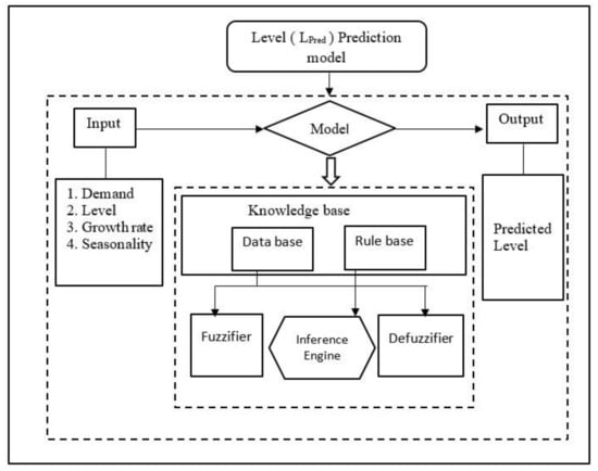 In this research, the developed fuzzy logic-based model is implemented in the Fuzzy Logic Toolbox of MATLAB R2009b where the Mamdani inference system is chosen for predicting the parameter level (LTpred). It is also necessary to define the input and output variables since their interrelations will materialize the objective(s) of the fuzzy logic-based model. Input variables i.e., the demand (DT), the level (LT), the growth rate (bT), the seasonal parameter (SNT), and output variables i.e., the predicted level (LTpred), in the MATLAB platform are exhibited by Figure A1 in Appendix A.