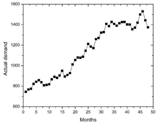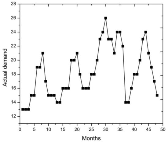 The demand data collected from a transformer tank manufacturing company are adopted to validate the proposed methodology. The company mainly produces three types of distribution transformer tanks such as 1000 KV, 750 KV and 500 KV. Among the three models, the 750 KV transformer tank is found to be the vital item for the company. Since the management reviews its production plan at the end of each month, the monthly demand for 750 KV transformer tanks is considered in this study. As presented in Figure 3, the historical records of monthly demand for transformer tanks over the past four years ranging from 2010 to 2013 were revealed by the company. The first three years’ data are used for the training and/or prediction model development purpose while the remaining data are used to test the proposed approach. However, prior to forecast, it is common to examine a time series for characterizing the presence of different demand patterns such as the randomness, trend, seasonality and cyclical behavior. In this context, a scatter diagram of time series representing the demand for 750 KV transformer tanks as shown in Figure 3 reveals an overall uprising trend with multiplicative seasonality.