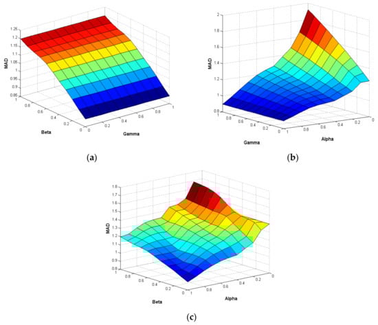 Figure 4a presents the results of the simulation in which the MAD values are changed in a line with the variation of β and γ while α remains fixed at its optimal value (α = 1). Figure 4b illustrates the effect of α and γ on MAD values with a fixed value of the variable β (β = 0), whereas Figure 4c shows the converging behavior of MAD with respect to α and β for a constant value of 0.2 for γ. It can also be seen that in all of these three exhibits, the MAD is converging to its unique minimal value of 0.89. Hence, the optimum values of the trio (α, β and γ) as obtained through simulation are 1.0, 0.0 and 0.2, respectively.