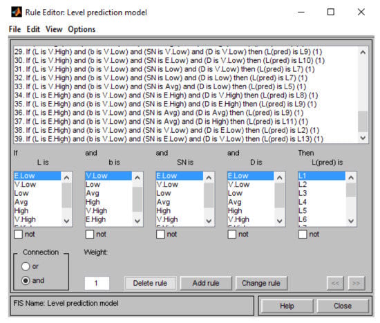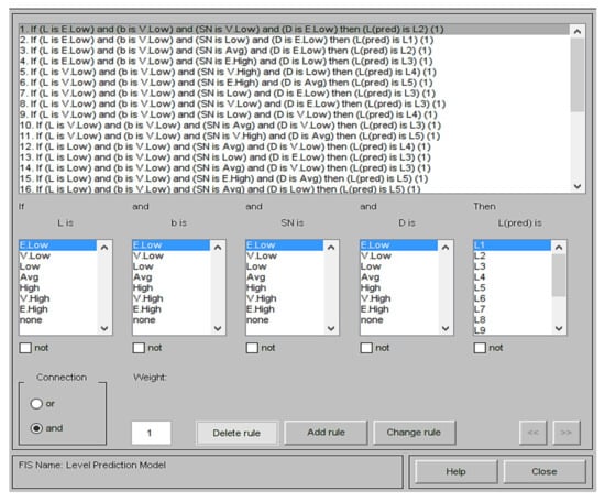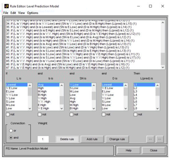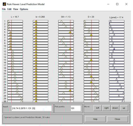 To perceive the defuzzification process mathematically and assess the validation of the developed level prediction model on MATLAB [56,57], an example is presented with an input for LT = 16.74, bT = 0.27, SNT = 1.13 and DT = 20.00 corresponding to the 19th month. The membership functions, the decision rules as well as the rule viewers of the fuzzy logic tool box (as shown in Figure 6) indicate that for the given inputs only the decision rule 11 is fired (i.e., output for this rule is non zero) and all other rules remain in the non-fired (i.e., output of these non-fired rules are zero) position. Similar to what is adopted by Hossain et al. [69], for this particular rule the fuzzy values of the input LT, bT, SNT and DT are computed by using Equation (7) and the values obtained are as follows: