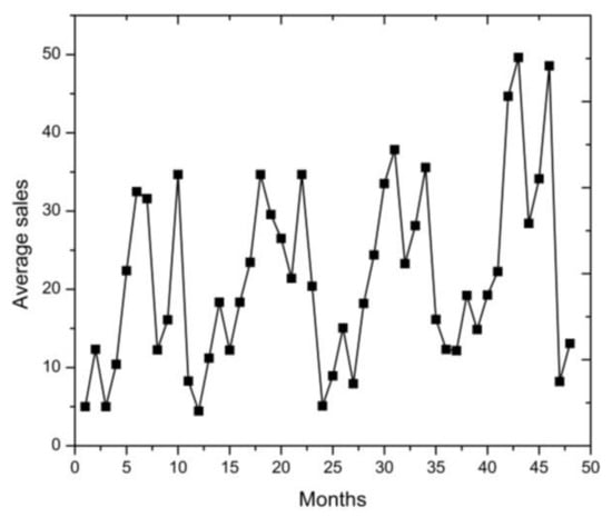 The average sales data of 4247 products of a Slovenian company named Danfoss District Heating, which was originally presented by Tratar [36], is adapted in this research for validating and assessing the strength of our proposed collaborative approach. The time series, as shown in Figure 7, represents the monthly average sales data for the time span of four years ranging from 2005 to 2008. The data set also depicts the varying means and the overall uprising trend with multiplicative seasonal patterns.