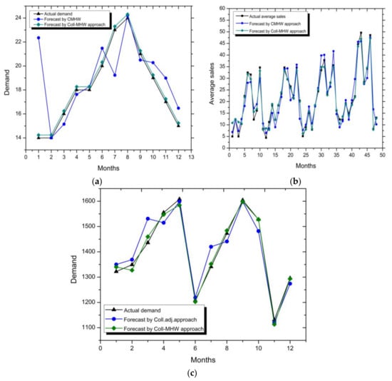 It would also be interesting to demonstrate the forecasting performance of the proposed approach for each of the individual periods of time series. In this respect, Figure 11a–c portray a comparative scenario for the three cases. The comparative scenarios as presented in Table 5 and plots in Figure 11a–c consistently reveal the superior performance of our proposed collaborative approach in comparison to the conventional MHW, improved MHW, ARIMA and Coll. Adj. forecasting models.