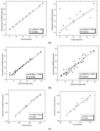 Apart from assessment of forecasting accuracy, the coefficient of determination is evaluated to reflect the strength and validation of the models. To check the appropriateness of our proposed model, the values for the coefficient of determination are computed and compared with those for other methods. For this purpose, the transformer tank demand over a period of one year, the average sales of Danfoss District Heating, and the data on plastic bag demand are used as before. Table 7 and Figure 12a–c exhibit the coefficient of determination.