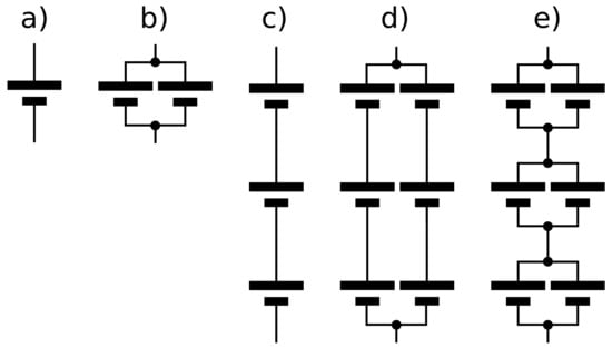 Schematic representations of different battery pack topologies: (a) single cell; (b) parallel connection of two cells; (c) series connection of three cells; (d) parallel connection of two strings of three serially connected cells; (e) series connection of three modules consisting of two cells connected in parallel.